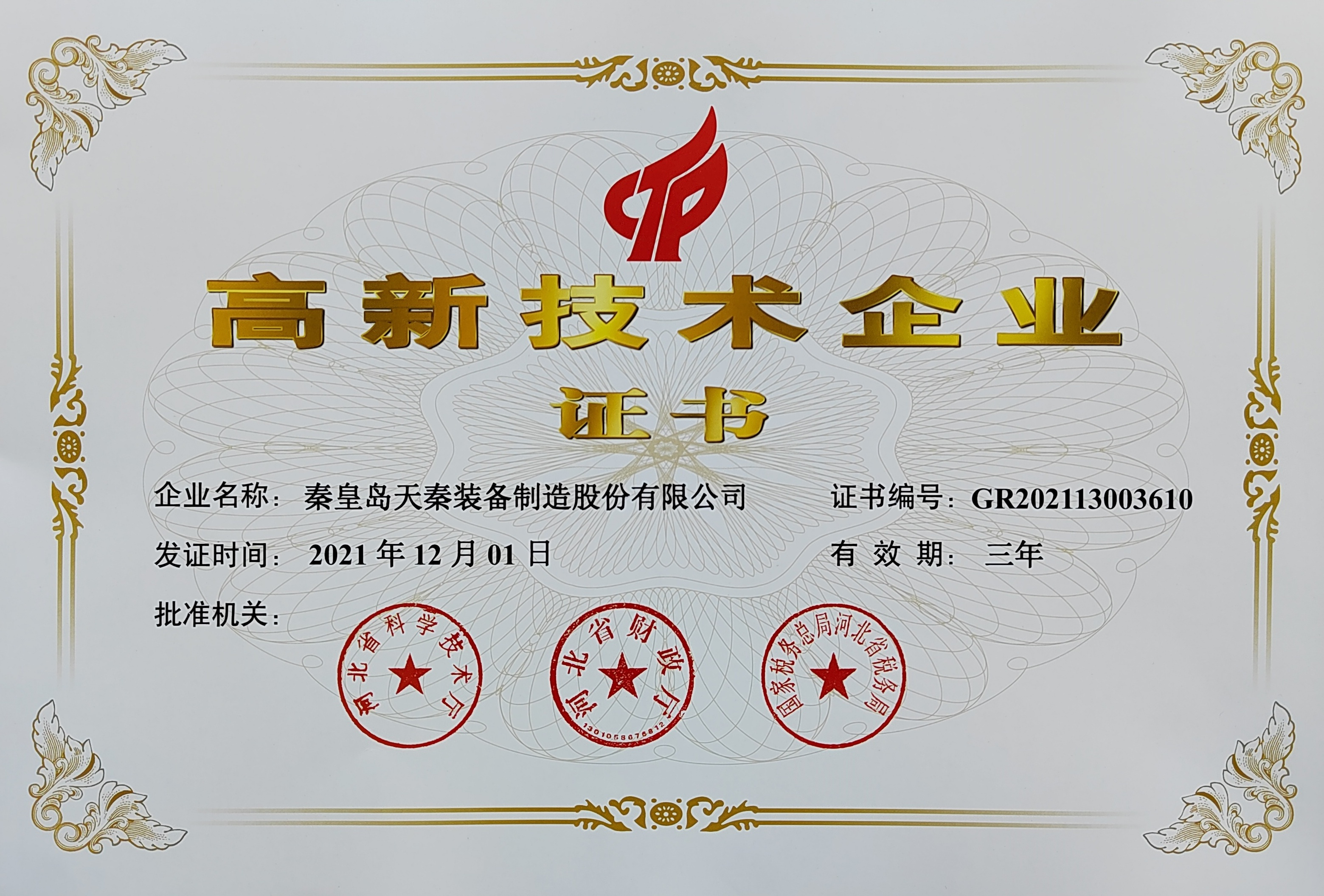 - 秦皇島天秦裝備制造股份有限公司創(chuàng)立于1996年,總部位于河北省秦皇島市經(jīng)濟技術開發(fā)區(qū),秦皇島廠區(qū)占地4萬平方米,擁有3萬平方米的標準廠房、辦公樓和工程技術研發(fā)中心;分部天津廠區(qū)位于天津市靜海經(jīng)濟開發(fā)區(qū),占地2萬平方米,擁有1.6萬平方米標準廠房。 公司通過了GB/T 19001質量管理體系及GB/T 24001環(huán)境管理體系認證,是國家高新技術企業(yè)、河北省軍民融合產(chǎn)學研用創(chuàng)建基地,建有省級院士工作站。